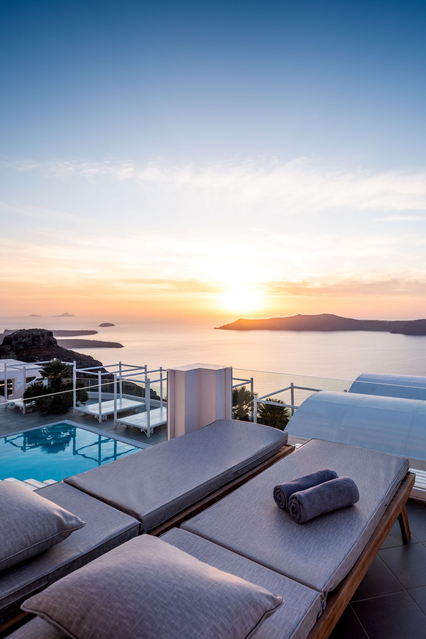 The suite boasts a modern bathroom with a shower and opens onto a private, expansive veranda that enhances your connection with the stunning Santorini landscape. The outdoor space is centered around a dining area and loungers, offering the perfect setting for al fresco meals or unwinding by your own heated plunge pool.