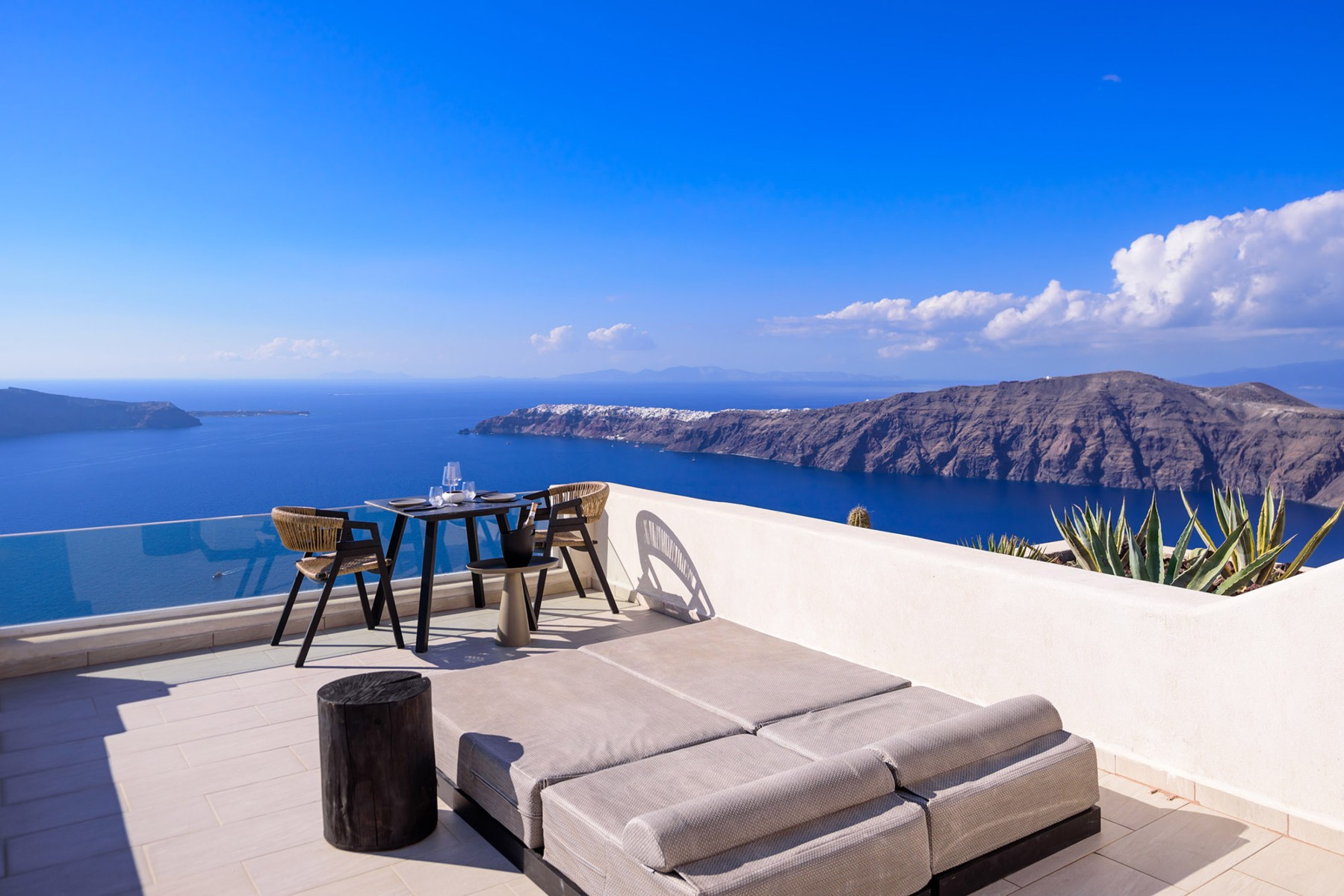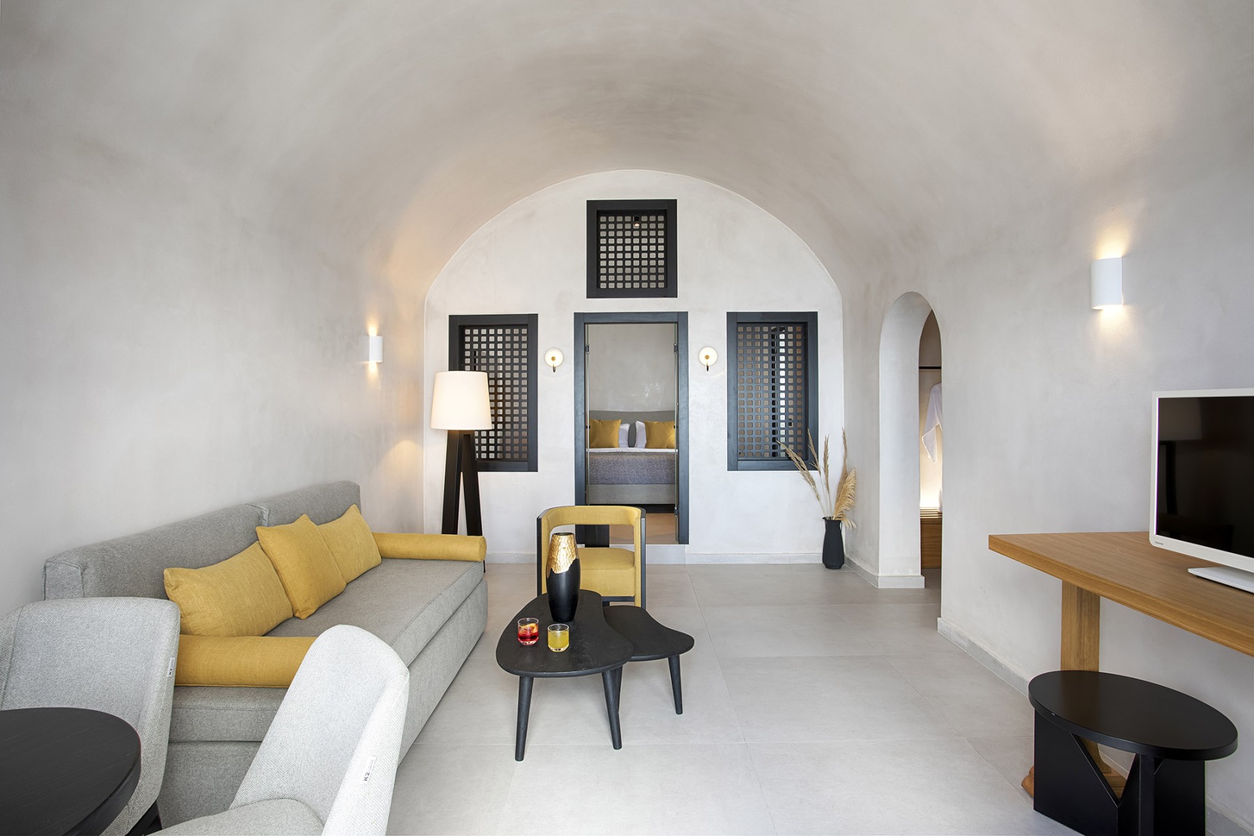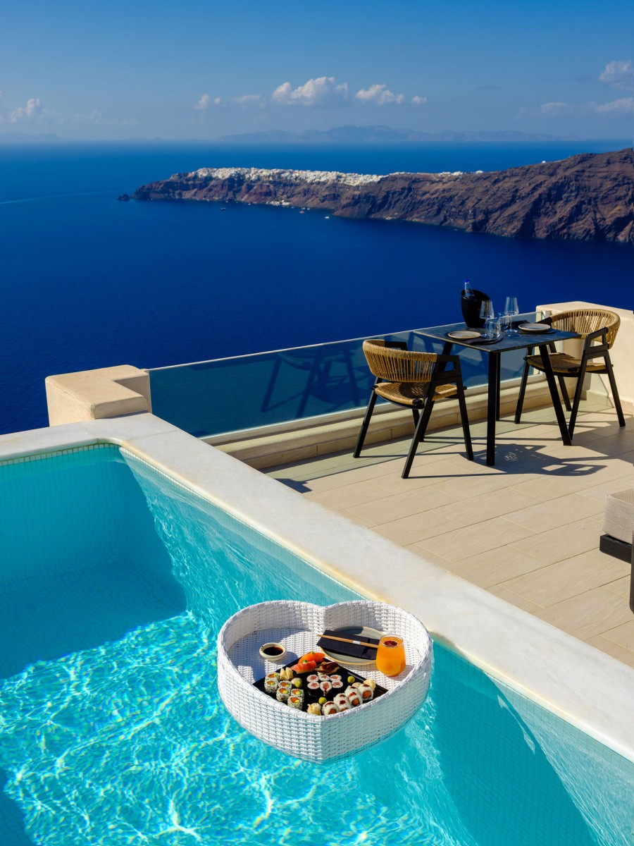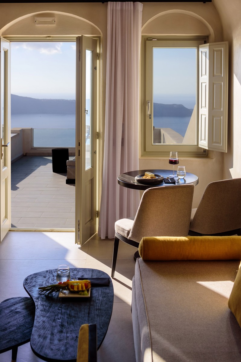 Η σουίτα διαθέτει επίσης ένα μοντέρνο μπάνιο με αναζωογονητικό ντους και ένα ιδιωτικό, επιπλωμένο μπαλκόνι, με ξαπλώστρες και ομπρέλες για απόλυτη χαλάρωση. Απολαύστε τα ζεστά νερά της εξωτερικής θερμαινόμενης πισίνας σας, απολαμβάνοντας παράλληλα την εκπληκτική θέα στην Καλντέρα και το Αιγαίο Πέλαγος.