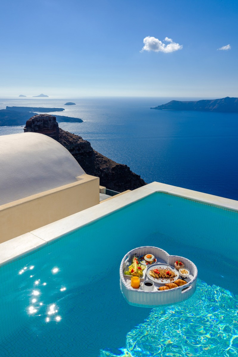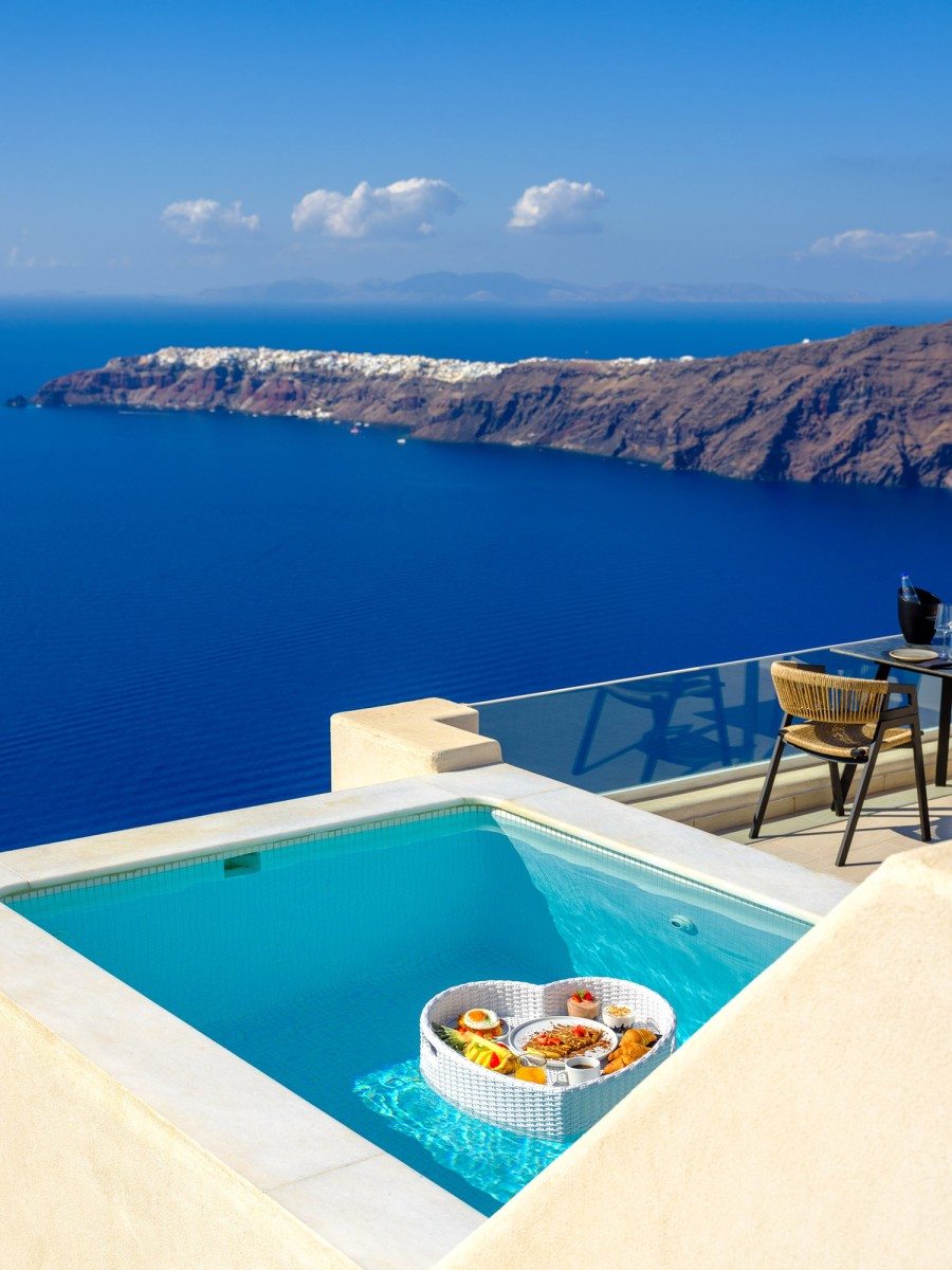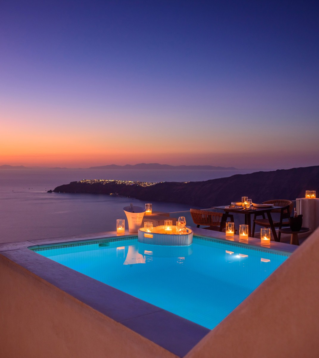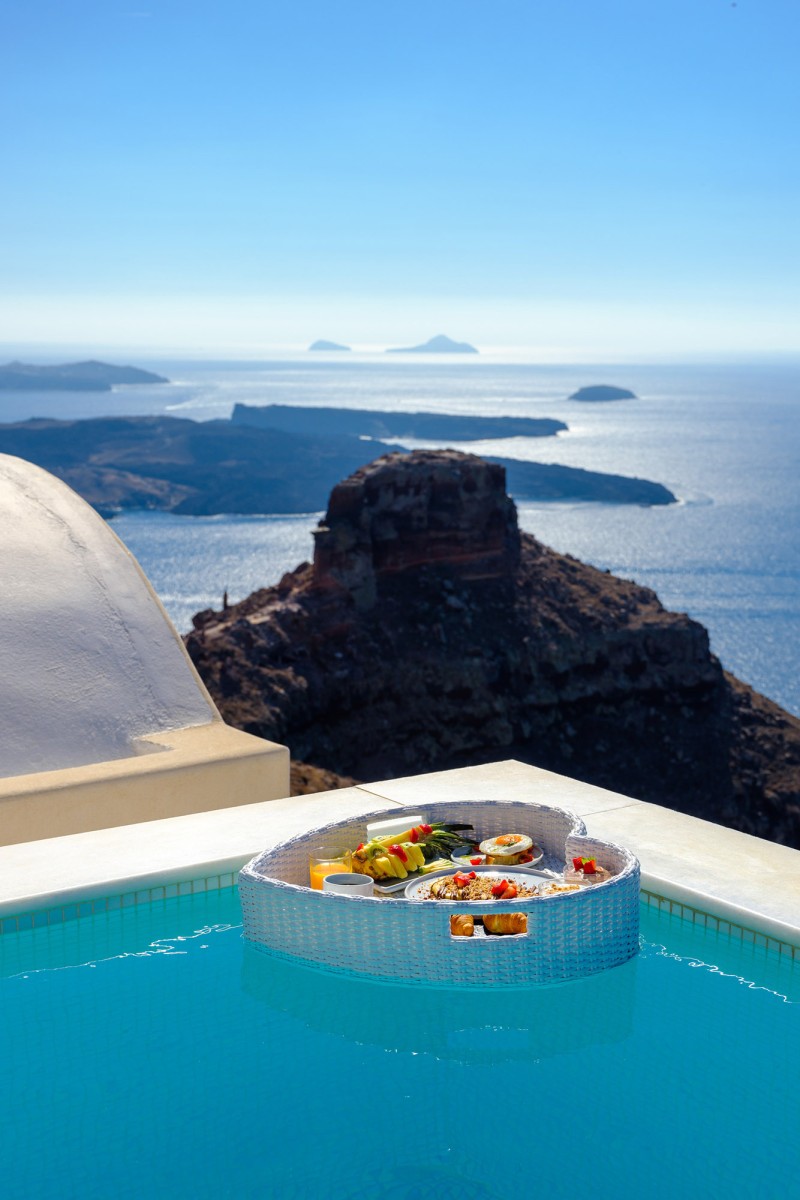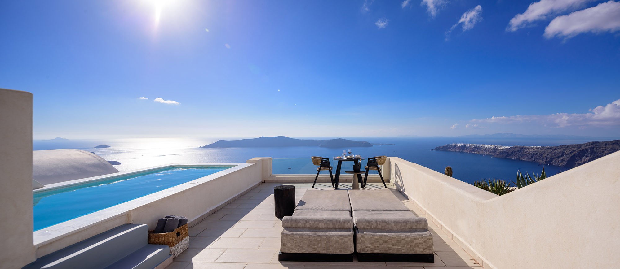 Η σουίτα διαθέτει επίσης ένα μοντέρνο μπάνιο με αναζωογονητικό ντους και ένα ιδιωτικό, επιπλωμένο μπαλκόνι, με ξαπλώστρες και ομπρέλες για απόλυτη χαλάρωση. Απολαύστε τα ζεστά νερά της εξωτερικής θερμαινόμενης πισίνας σας, απολαμβάνοντας παράλληλα την εκπληκτική θέα στην Καλντέρα και το Αιγαίο Πέλαγος.