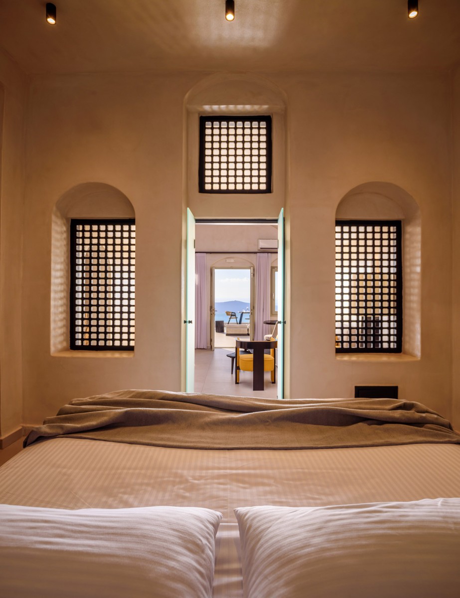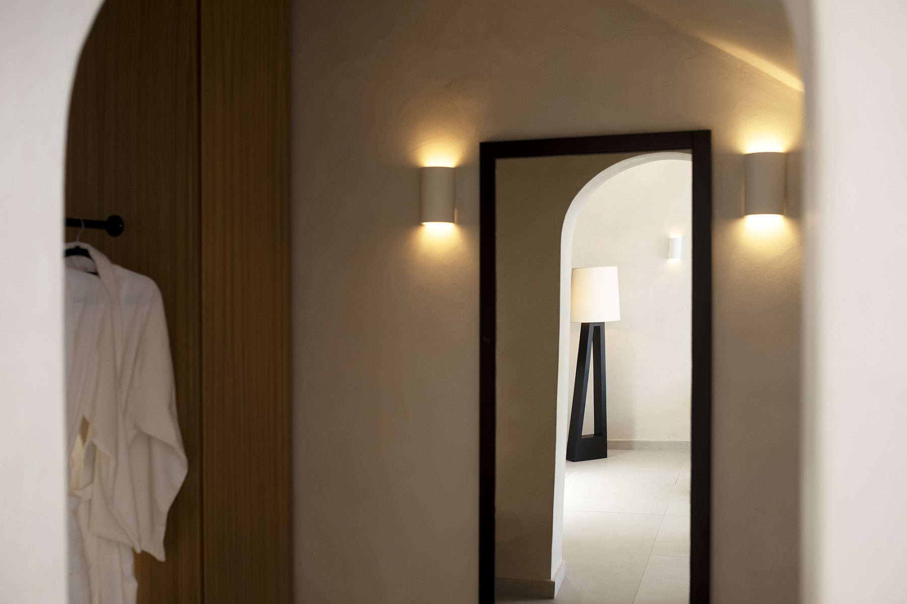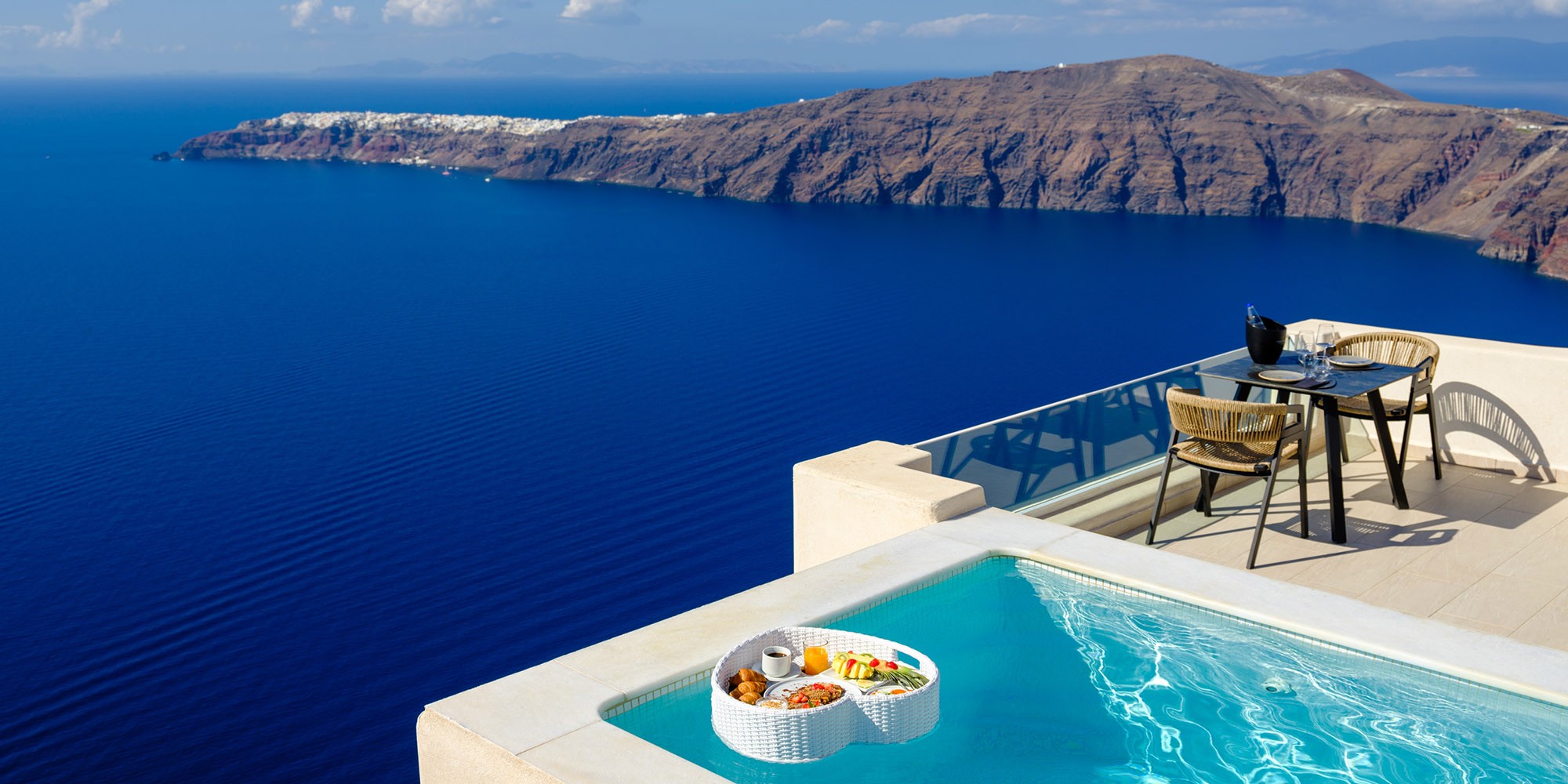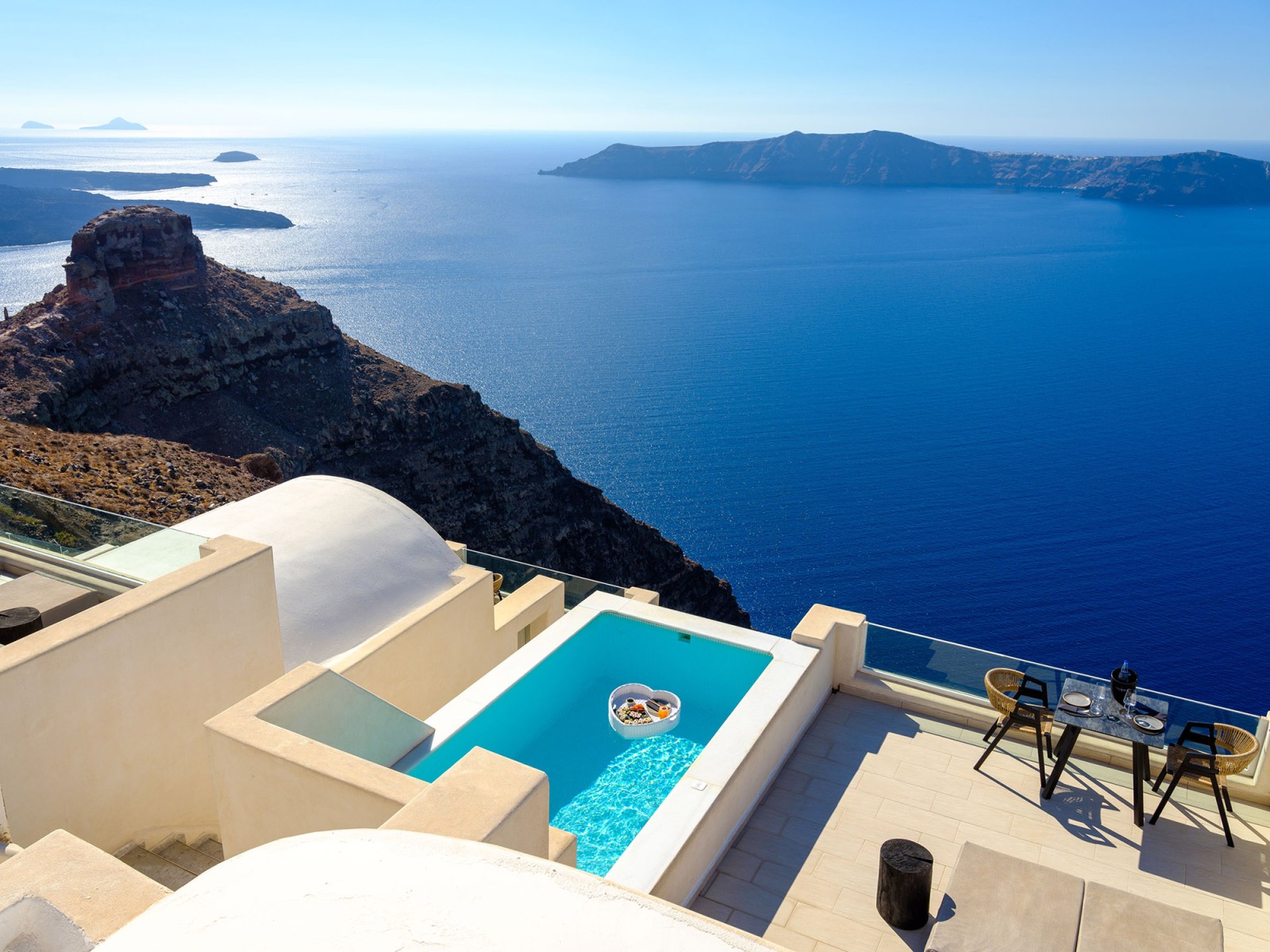 Η σουίτα διαθέτει επίσης ένα μοντέρνο μπάνιο με αναζωογονητικό ντους και ένα ιδιωτικό, επιπλωμένο μπαλκόνι, με ξαπλώστρες και ομπρέλες για απόλυτη χαλάρωση. Απολαύστε τα ζεστά νερά της εξωτερικής θερμαινόμενης πισίνας σας, απολαμβάνοντας παράλληλα την εκπληκτική θέα στην Καλντέρα και το Αιγαίο Πέλαγος.