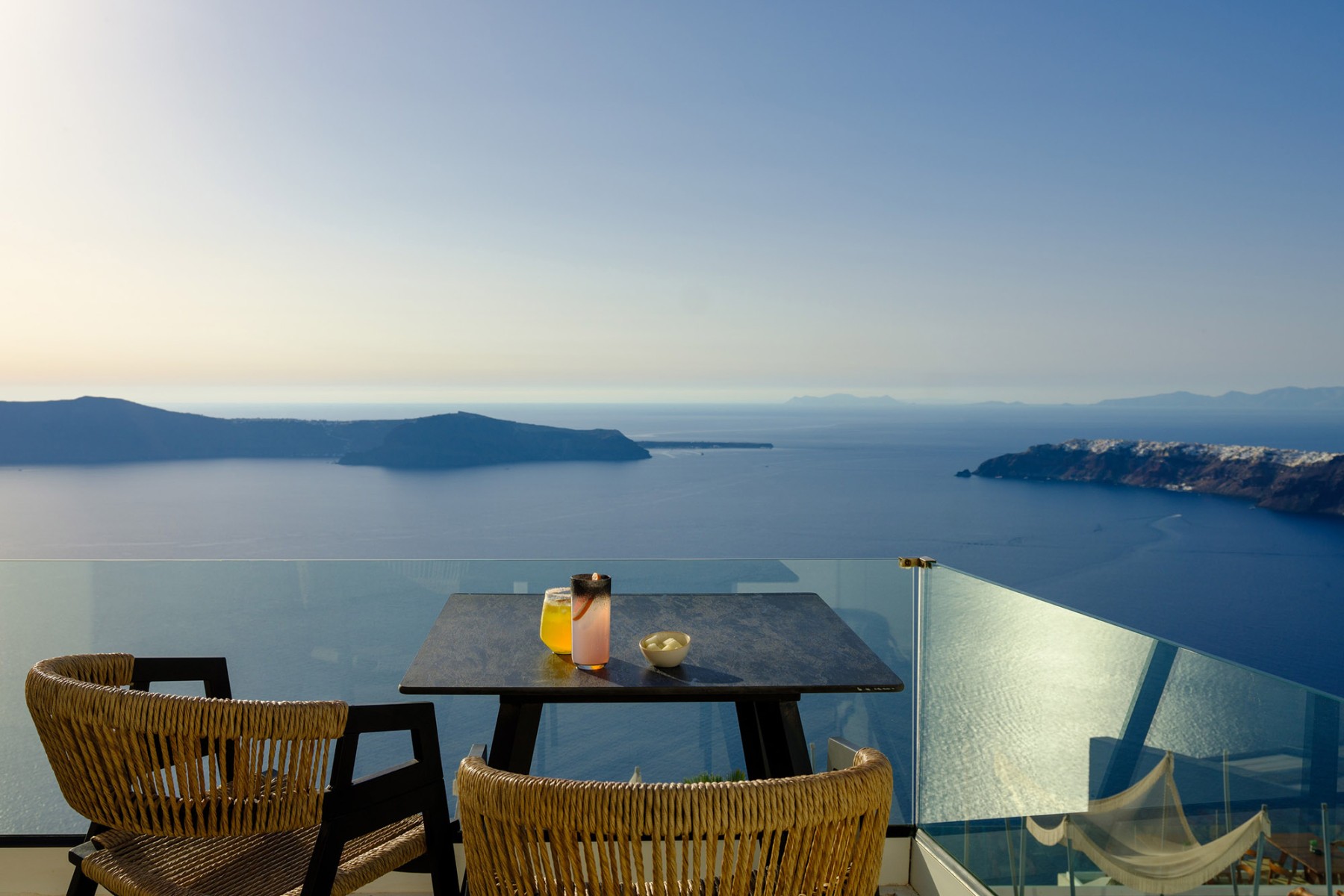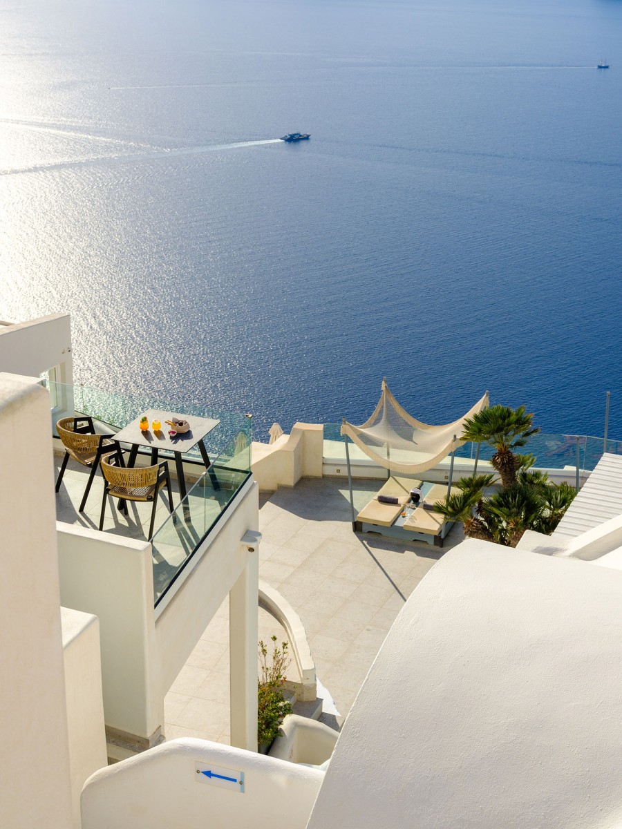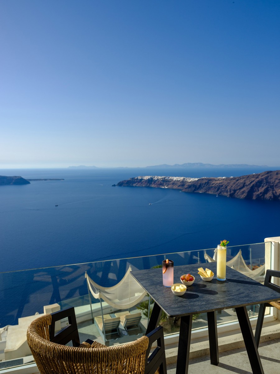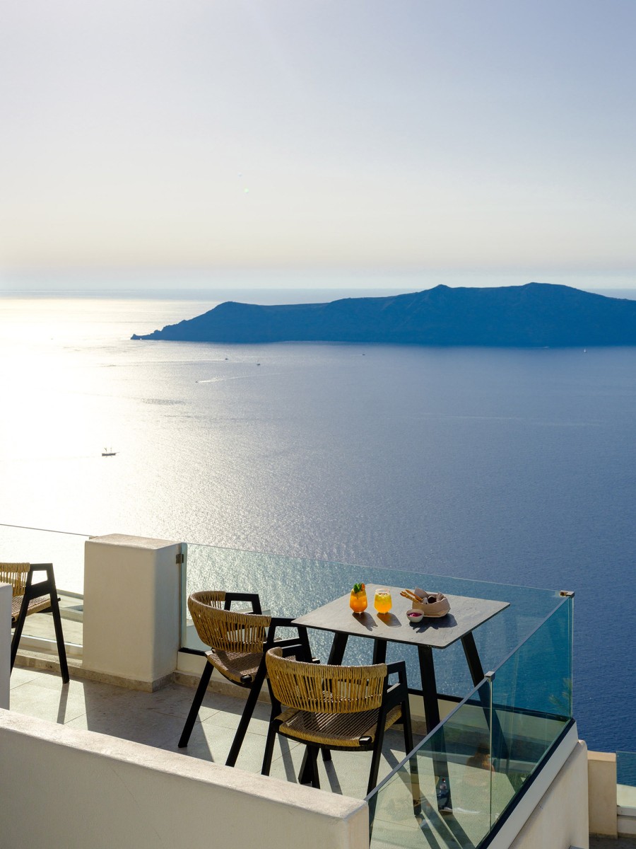 Βγείτε έξω στο ιδιωτικό σας μπαλκόνι ή βεράντα, όπου μπορείτε να απολαύσετε εκπληκτική θέα στο Αιγαίο Πέλαγος και την εμβληματική Καλντέρα - το τέλειο σκηνικό για ένα ήρεμο πρωινό ή ένα βράδυ χαλάρωσης.