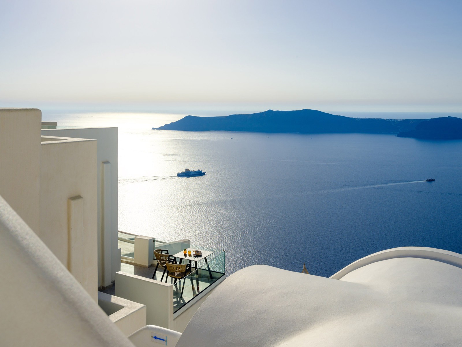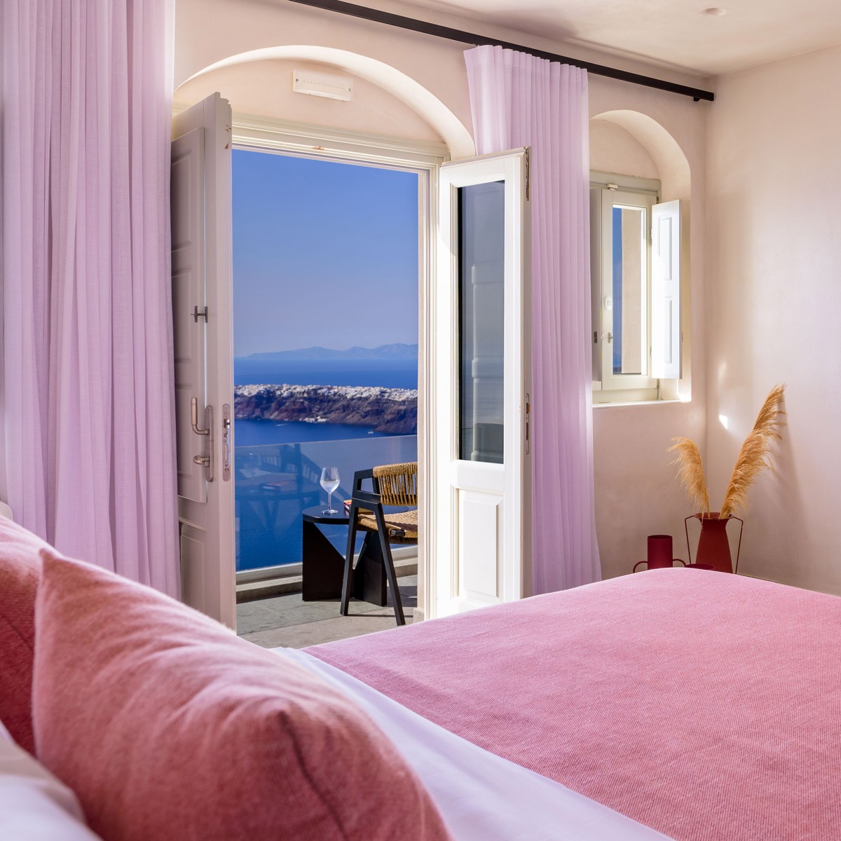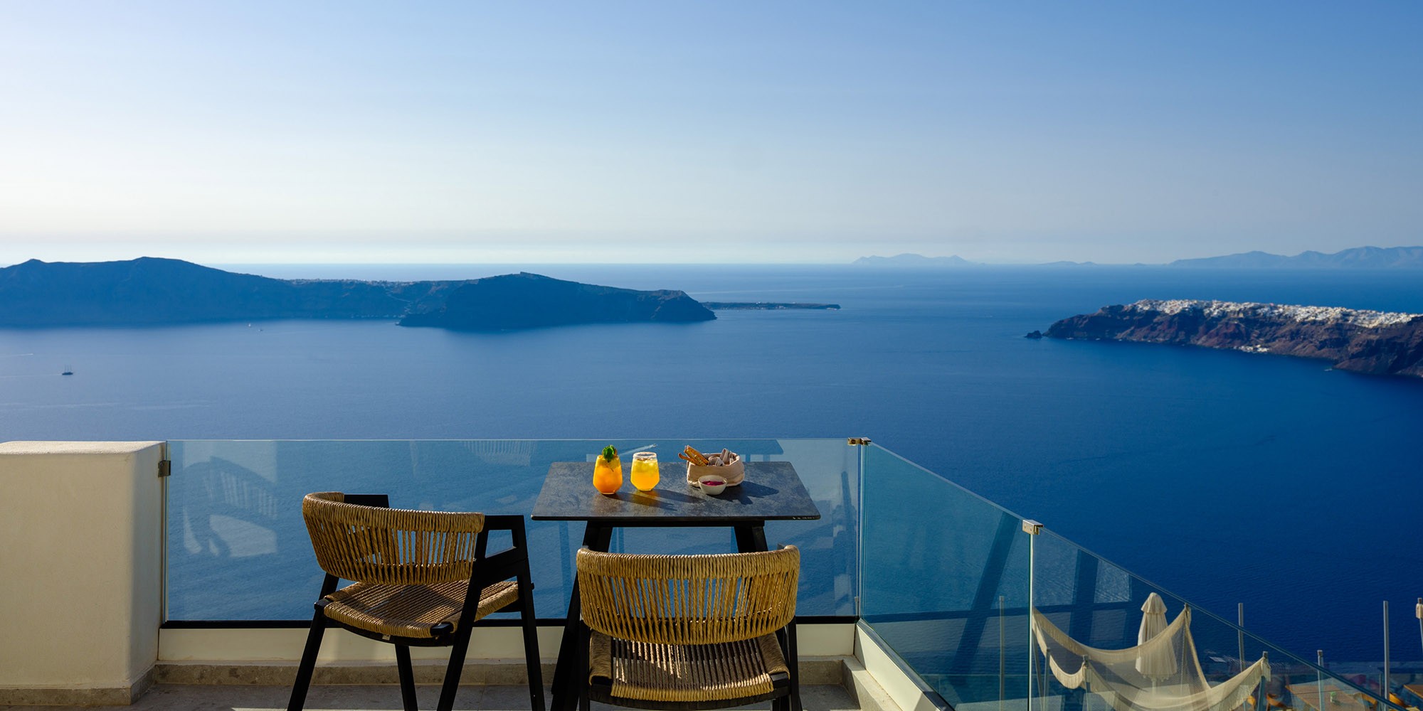 Βγείτε έξω στο ιδιωτικό σας μπαλκόνι ή βεράντα, όπου μπορείτε να απολαύσετε εκπληκτική θέα στο Αιγαίο Πέλαγος και την εμβληματική Καλντέρα - το τέλειο σκηνικό για ένα ήρεμο πρωινό ή ένα βράδυ χαλάρωσης.